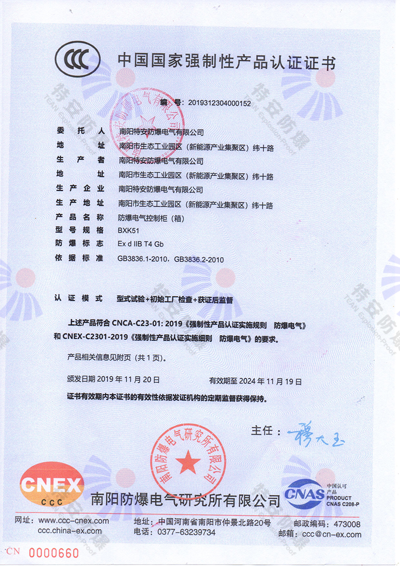 防爆電氣控制箱IIB  中國國家強制性認證證書(3C證書)